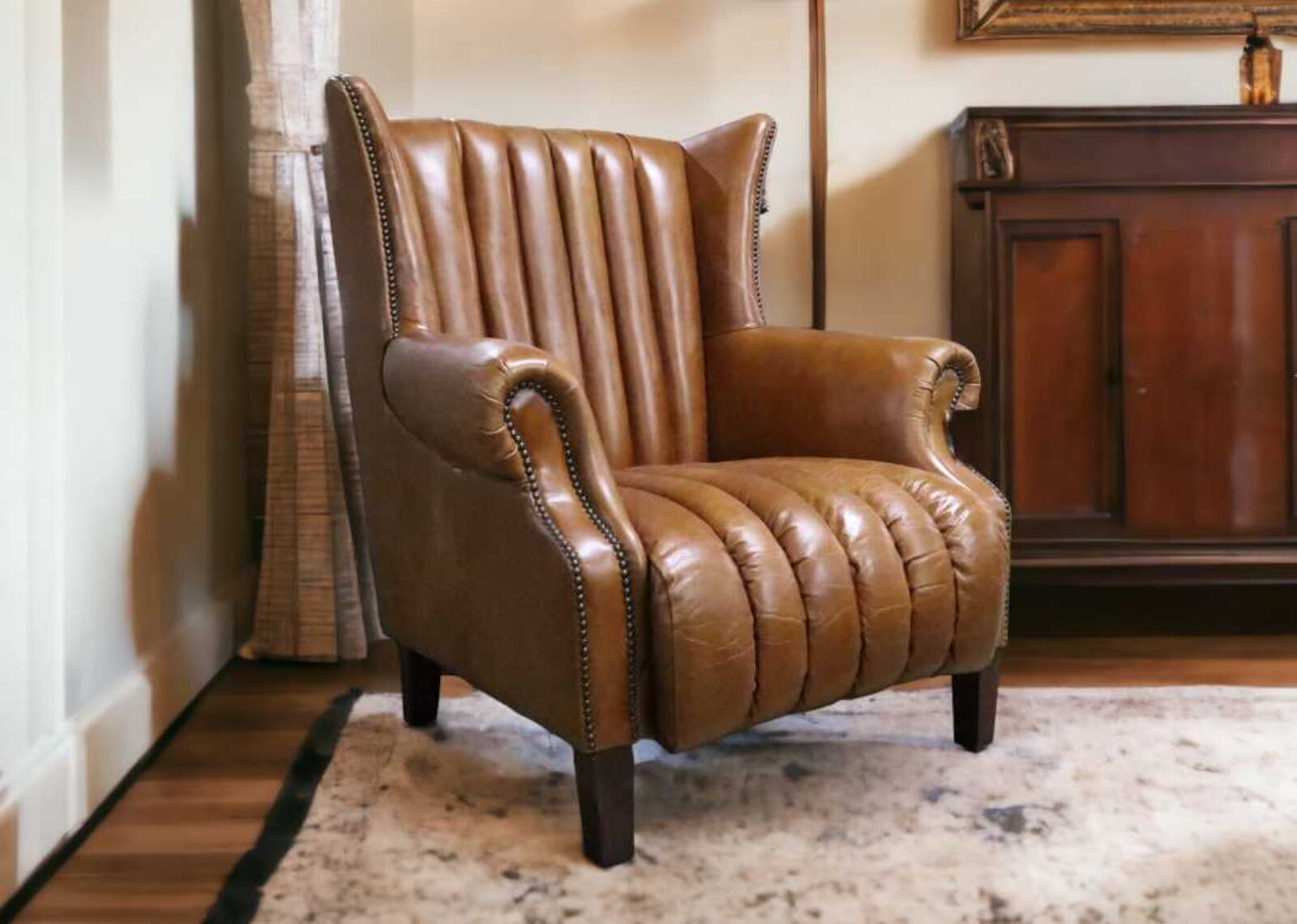 View at designersofas4u.co.ukCuban Cigar Vintage Tan Distressed Leather Wingback Chair