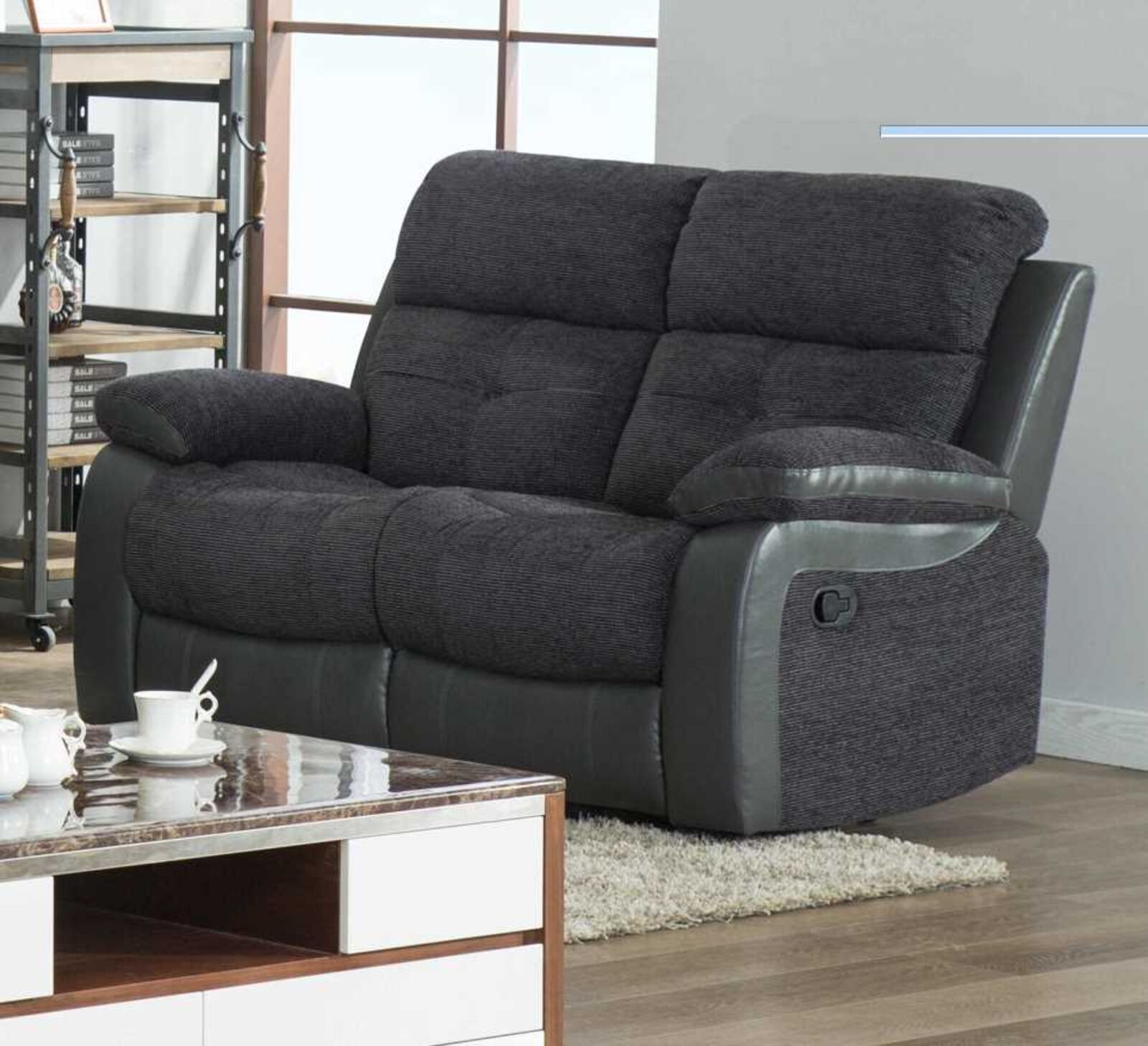 View at designersofas4u.co.ukHolden 2 Seater Sofa Reclining Dark Grey Fabric And Leather