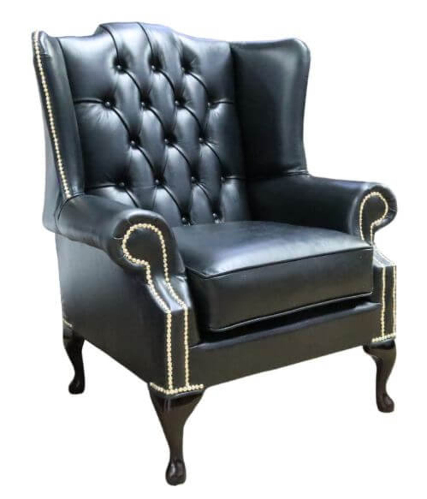 View at designersofas4u.co.ukOld English Black Leather Chesterfield Bloomsbury Flat Wing Queen Anne High Back Wing Chair STOCK