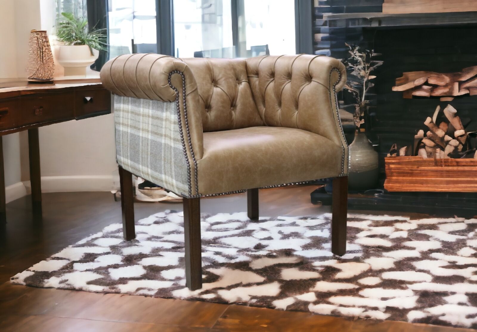 View at designersofas4u.co.ukChesterfield Devon Tub Chair Cracked Wax Tan Leather With Tartan Fabric Fixed Seat