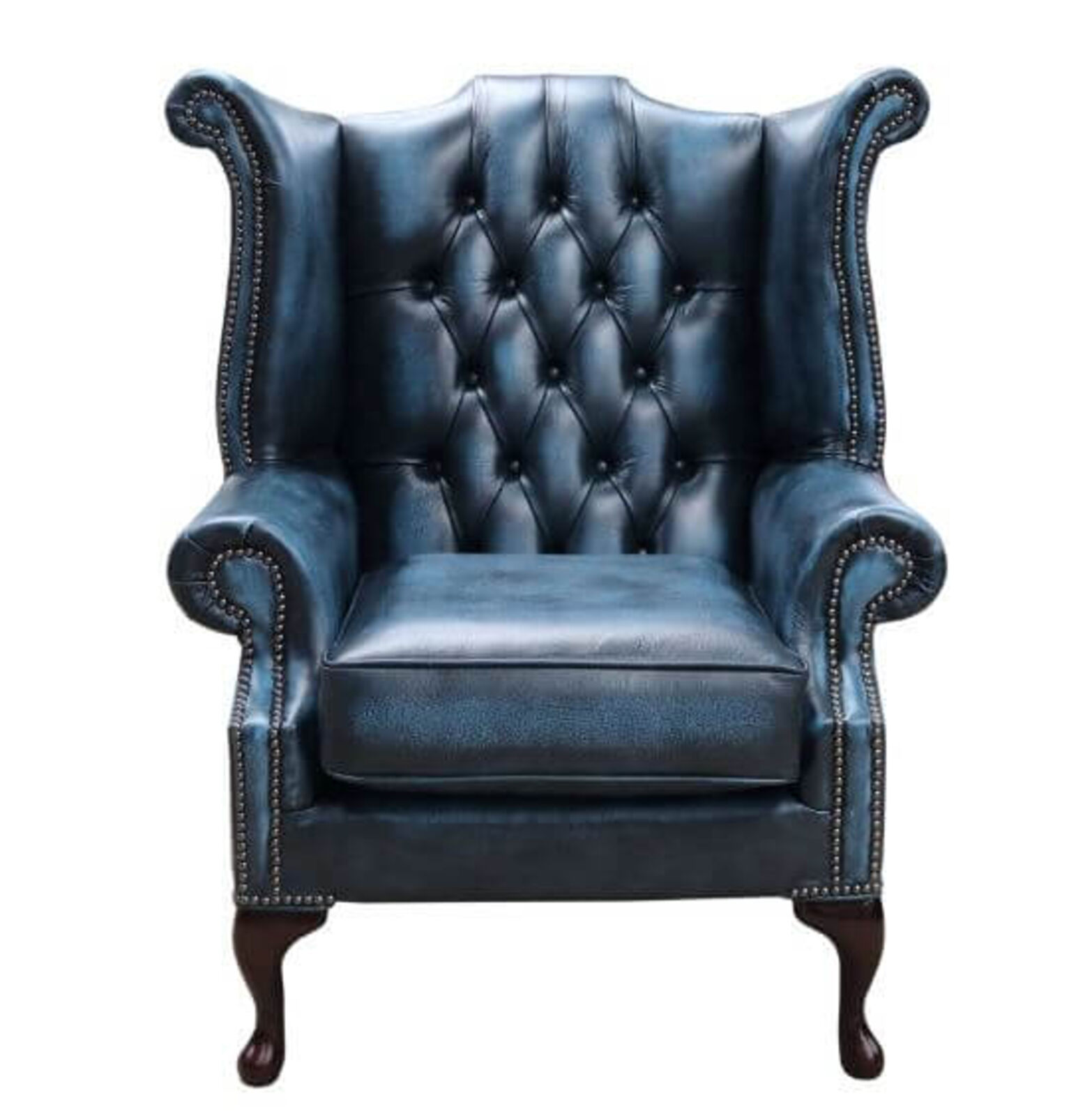 View at designersofas4u.co.ukChesterfield Handmade Queen Anne Wing Chair Antique Blue Real Leather