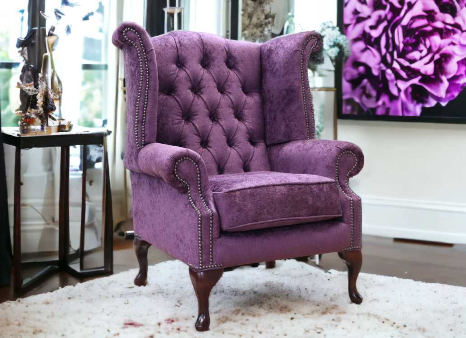 View at designersofas4u.co.ukChesterfield Queen Anne Chair Purple Fabric