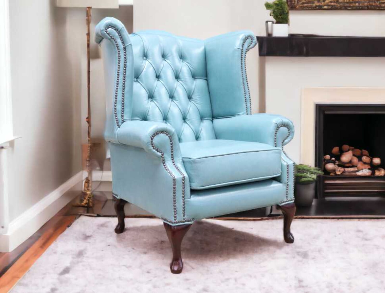 View at designersofas4u.co.ukChesterfield Queen Anne High Back Wing Chair Old English Placid Lake Blue Leather