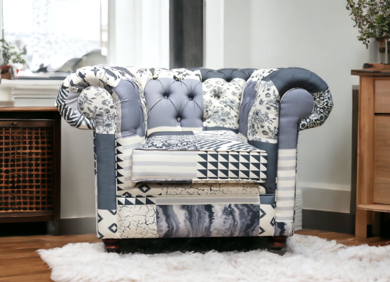 View at designersofas4u.co.ukChesterfield Thomas Low Back Club Chair Charles Patchwork Beige Fabric