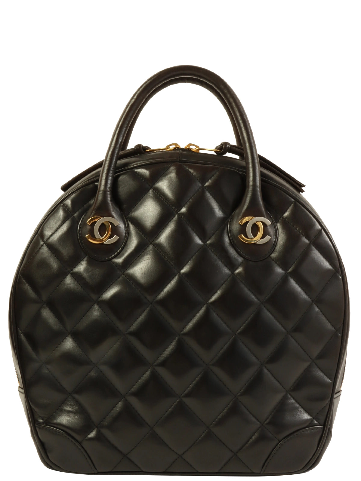 View at openforvintage.comCHANEL Around 1997 Made Turn-Lock Twist Top Handle Bag Black